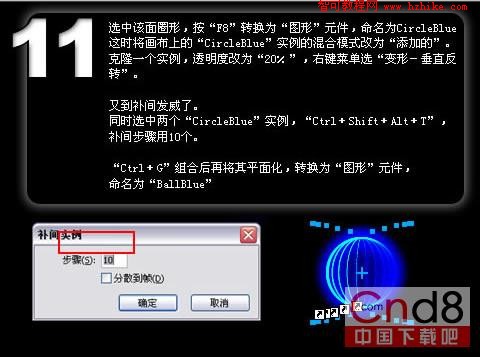 又到補間發威了。同時選中兩個“CircleBlue”實例,“Ctrl+Shift+Alt+T”,補間步驟用10個。