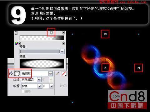 9. 畫一個矩形將圖像覆蓋,應用如下所示的填充和漸變手柄調節。營造明暗效果。(呵呵,這個是慣用伎倆了。)