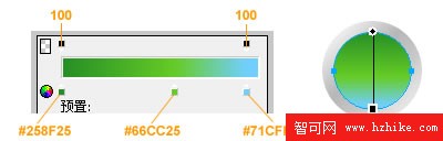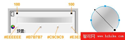 在這個圓的上面畫一個70x70的正圓形,改變填充類別為線性漸變,增加並調整漸變顏色,水平、垂直對齊於畫布(或對齊於它下邊兒的那個圓)。(圖04)