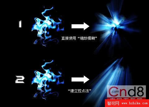 但是要求做到圖2的效果,也就是可以控制“縮放模糊”的方向,就要用到RockHward原創的“建立控點法”了。