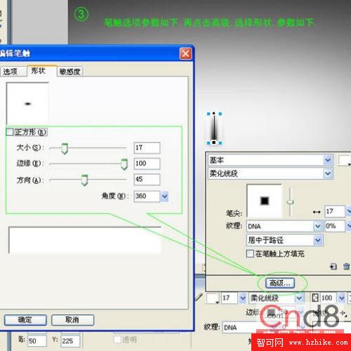 3、筆觸選項參數如下,再點擊高級,選擇形狀,參數如下: