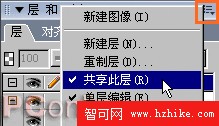 我們注意到,在這個表情中只有汗滴是需要做成運動的,而其它對象則仍保持著靜止狀態。因此我們可以考慮將該汗滴轉成動畫元件的方式來完成這一動畫過程。我們點擊“層”面板中右上角的下拉菜單,從中選擇“共享此層”,如圖24.