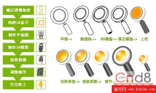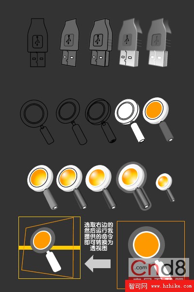 13.過份仿真的圖標在使用起來是沒有太大意義的,真正的圖標要使用起來必須顏色清晰,容易區分,有體量感(胖一點).而且實際制作中,一套圖標要風格統一.你可以使用同樣角度的透視或者同樣的配色或者同樣的表現風格.這裡我使用了同樣的透視,這就意味著整套圖標的透視都用同一個透視的命令.如下另一例子