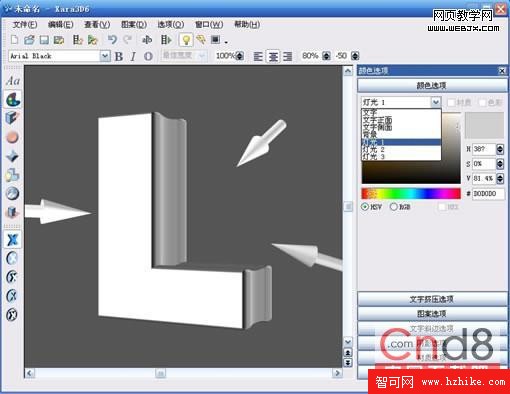 在右側顏色選項中把燈光1設置為白色,燈光2、燈光3均為灰色。色彩在Fireworks中調整。在查看菜單中,選擇顯示燈光。