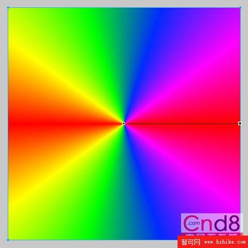 9、幾分鐘後,整個迸發的光球打底已經完成。確定不需要再修改後,把分散在各層的點陣圖再Ctrl+G/群組起來。然後我們把這一組在層面板上點掉眼睛圖示,將這層隱藏起來。接下來開始為光球賦予五彩光環。在畫布上畫出與畫布同等大小的方形,填充漸變方式為Cone錐形,點擊色彩圖示,調出填充漸變色面板。在預設選項下,色彩選擇Spectrum/光譜。