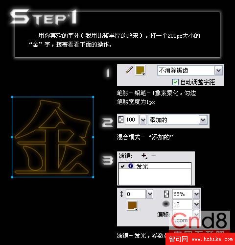 1 用你喜歡的字體(我用比較豐厚的超宋),打一個200px大小的“金”字,接著看看下面的操作。