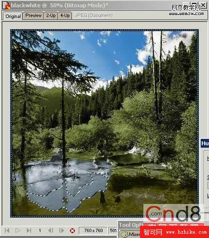 下圖的選區,水這塊顏色分得不是很明顯很難選,呵呵,只要把tolerance裡的值調小了一點,就很容易做到了!
