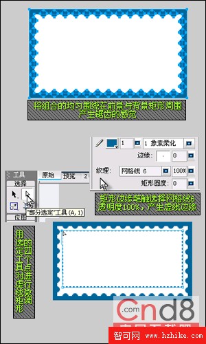 步驟七、再用矩形工具拉出一個矩形,盡量叫矩形占居圖案的靠上位置,下面留出一些空隙,其邊緣筆觸選擇網格線6,透明度100%,從而產生虛線,如矩形有的邊緣沒有顯示虛線,請用“選定工具”點中矩形邊緣的點配合鍵盤微調。
