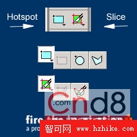 熱區和切割最後會被輸出成標准的Html代碼,你只要將這些代碼插入到頁面相應的位置就可以了。我們應該很容易找到熱區和切割在工具欄中的位置,並且看到他們的擴展工具,入圖: