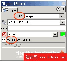 選中這個切割,打開Object面版(Window->Object),可以看到和切割相關的屬性:鏈接的URL地址,alt的文字,打開鏈接的方式(Target)這些都和熱區一樣,Auto-Name Slices是用來設置是否自動為切割的圖片命名。