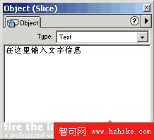 在Type菜單裡可以看到2項:Image和Text。選擇Image切割就會被輸出成圖片保存;選擇Text後,可以在Object面版中輸入文本格式的文字,輸出後這部分切割會留出空白的單元格用文本填寫。這個功能對於需要經常更改消息的頁面相當方便,這樣就不用每次都創建圖片。