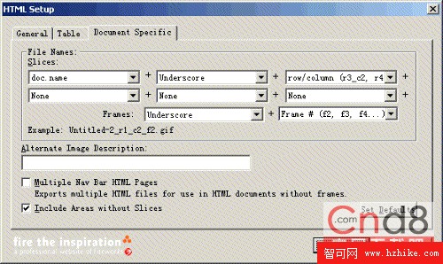 在最後輸出之前,選擇File->Html Setup來到Document Specific這項可以設置Fireworks自動命名文件名的規律,一般沒有特殊要求就使用默認設置吧。