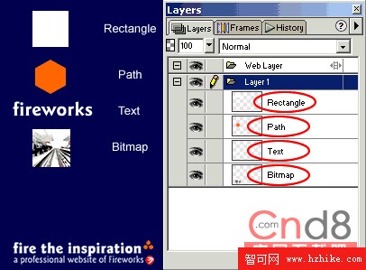矩形/路徑/文本具有矢量圖形的特性,可以任意的放大、縮小,同時他們都可以轉換成位圖(選擇Modify->Convert to Bitmap),但是一旦轉換成位圖就不能轉換回來。在Fireworks4中,每個對象都會擁有一個自己的子層,子層之上是父層(關於層的詳細介紹請查看與層相關的章節)每個層都標明了這個對象的類型,它可以在Layer面板中看出來,如圖: