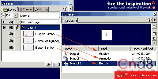 最後要介紹的是符號(Symbol),以上提到的任何一種對象都可以轉化為符號,選擇Insert->Convert to Symbol,每建立一個符號對象都能夠在Libray面版(選擇Window->Library)中看到,層上的類型名稱也會起相應的變化。