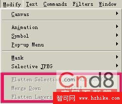 在Fireworks MX中把Fireworks4的轉化位圖命令“Convert to Bitmap”改變成了“Flatten Selection”命令,兩者功能相同。此外Fireworks4中合並圖層的命令只有“Flatten Layers”,而在Fireworks MX中設置了還增加了一個“Merge Down”(向下合並圖層)的命令,加強了操作的可控性。