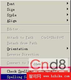 在Fireworks MX的文本菜單中增加了一個文本拼寫查錯檢查器:“Check Spelling”和“Spelling Setup”,這個功能的增加了Fireworks MX的文本編輯能力,體現了對E文的全面支持,對E文不太好的朋友來說還是有一定幫助的,不過對中文的支持有BUG,老出現問題,希望在其正式版本中能得到改進。