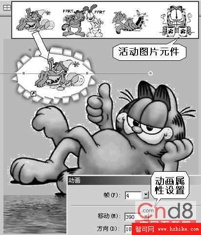 按“Ctrl+F8”快捷鍵將它轉換為元件,設置屬性為動畫,設置動畫幀數為4幀,移動390像素,方向為180度。這裡的4幀是為了每幀顯示活動圖片的四分之一,也就是一個圖像;移動距離是根據組合圖片長度的四分之三確定的;方向180度是由右向左移動(默認值0度,為由左向右移動)。