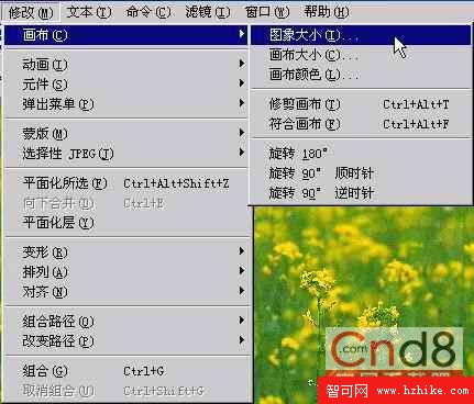 2.打開“修改”菜單,單擊“畫布”裡的“圖象大小”。