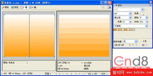 3、切換到【兩幅】的預覽窗口,打開Fireworks的【優化】面板,在【優化】面板中選擇格式為“Gif”,【索引色調色板】為“最合適”,【顏色】可以選擇“16”或“8”,這裡選擇的是“8”,效果如下圖所示。