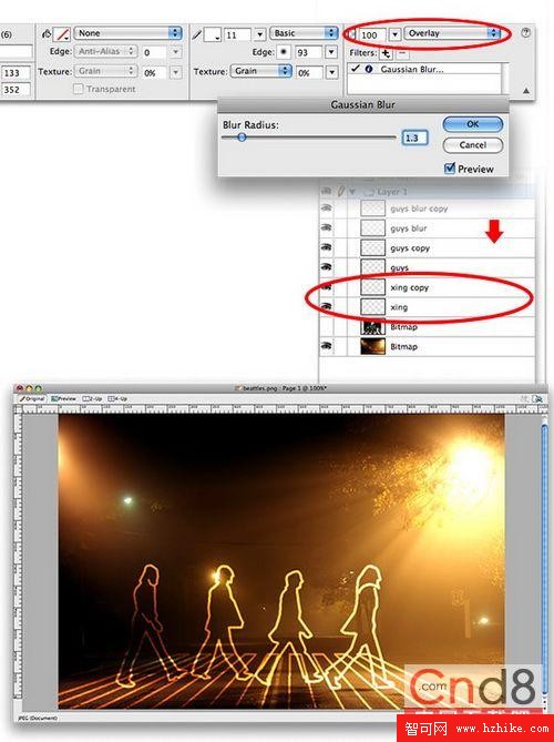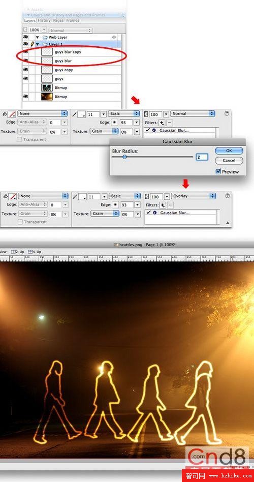 5,復制我們之前做好的人物剪影輪廓描邊3次,隨後為最上面的輪廓圖層(guys blur copy)使用高斯模糊,設置模糊范圍為2,然後將四個圖層同時選中,使用混合模式中的“正片疊底”,這樣之前的白色輪廓就會以金色背景為底色,制作出很特殊的漸變效果
