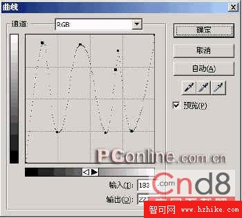 14、接下來可以選中位圖對象,然後選擇屬性面板上的效果菜單中的“調整顏色 | 曲線”效果命令,在本例中,進行了如下圖所示的設定。