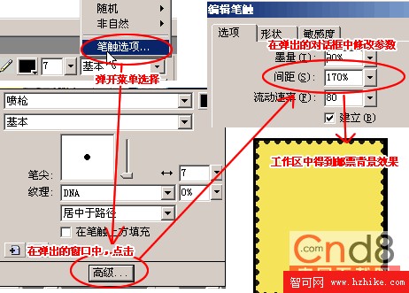 3、在畫一個矩形,大小為144*174,位置為261*143,填充顏色選擇黃色(色彩代碼:#F5E459)。邊線顏色為黑色,選擇邊線的樣式“噴槍”—>“基本”,點開“基本”菜單,選擇“筆觸選項”打開菜單,點擊“高級”按鈕,彈出“編輯筆觸”對話框,在“選項”下修改“間距”為170%,最後在工作界面我們看到郵票背景效果,如圖二。