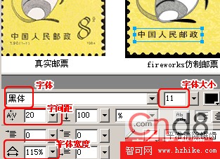 1、選中工具箱中的文字工具,輸入“中國人民郵政”。在屬性面板中調整字間距、字體等參數。字體設定為黑體、大小為11號,字間距寬度為20,字體寬度為115%。現在看文字是不是和郵票原樣中的文字相同了。如圖五,文字的位置在工作界面中的371*379。