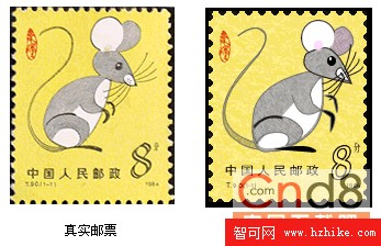 今天我教大家用Fireworks MX來設計我國發行的第一枚鼠年郵票,是1984年發行的,距離今天有十八年之久了,你還記得它的樣子嗎?圖一中你可以看到我用數碼相機拍攝的真實郵票,以及用Fireworks MX 仿制的最終效果。