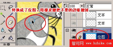 3、在形成的圖形有一點需要特別說明,例如畫老鼠的手,和身體相接的部分沒有邊緣,在肚子前面和手掌相接的部分有邊緣的。這是如何做的呢?先畫好手形狀,然後選中它,按下鍵盤Ctrl+Shift+Alt+Z鍵,將矢量圖轉換成位圖,可以在層面板中看到轉換結果。現在用橡皮擦工具把不需要的邊緣擦掉。如圖四