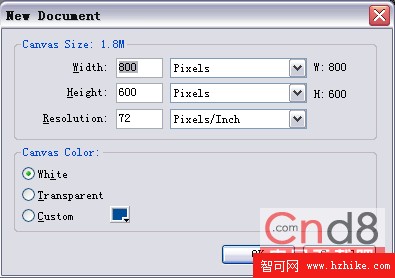 打開Firworks MX,使用菜單命令新建一個文件,大小為800*600,背景色為白色(如圖1)。