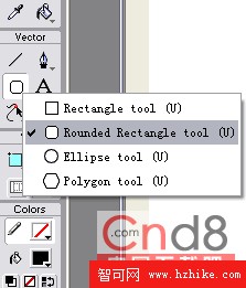 在工具欄上鼠標在矩形工具圖標上按下不放,在彈出的菜單中選擇圓角矩形(Rounded Rectangle Tool)(如圖2),