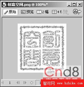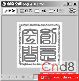 3. 點擊“文字”工具按鈕,用鼠標在上一步設置完成的紅色邊線內拖拽出文字輸入區域,鍵入“創意空間”四個字。字號的大小要根據所畫出的正方形印章的大小來設定,使其能夠正好將所有文字容納進去。至於文字字體的選擇,這是印章效果的一個重要設置,Windows字庫中的字體是不能夠滿足需要的,為了達到逼真的古印章效果,我們可以下載一些古體、繁體字庫,將其放入Windows目錄下的“Font”文件夾中即可。圖2中使用的是“迷你繁方楷”,另外“文鼎古印繁體”或者“長城古印繁體”的效果也非常好。