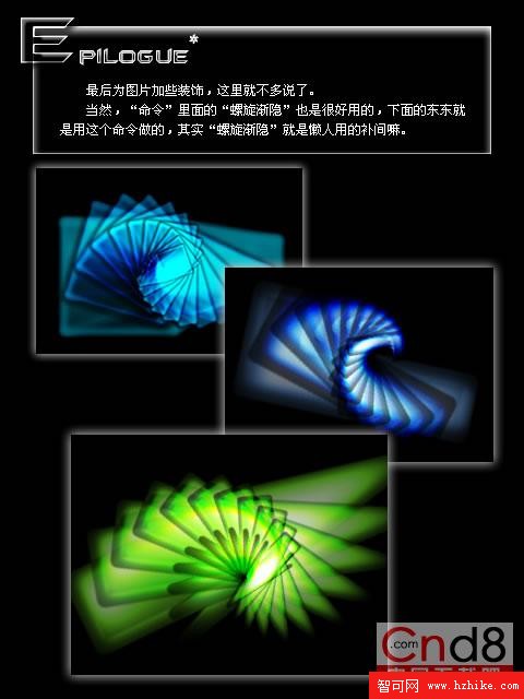 當然,“命令”裡面的“螺旋漸隱”也是很好用的,下面的東東就是用這個命令做的,其實“螺旋漸隱”就是懶人用的補間嘛。
