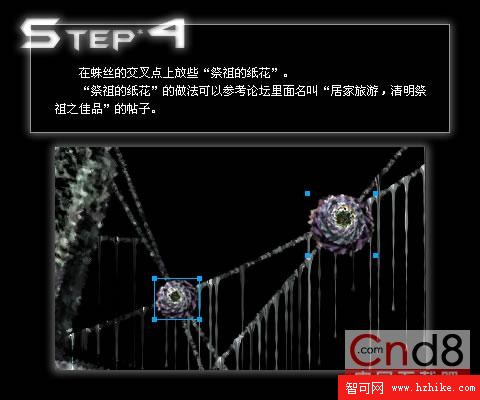 在蛛絲的交叉點上放些“祭祖的紙花”。