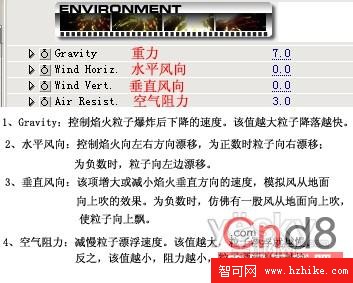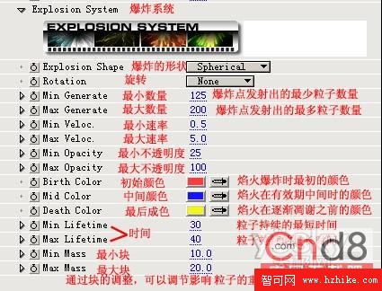 Explode at Speed模式“Explode Speed” 項一起確定焰火開始爆炸時的速度,Explode Speed的值越負,焰火將向下運動然後爆炸的效果越明顯。