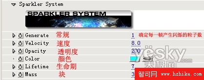 2、Rotation:控制粒子圍繞爆炸點旋轉方式,也就是粒子的運動軌跡。主要有None(不旋轉)Constant(不變的, 持續的)Varying(變動)Squiggle(花體)四種方式。其中None(不旋轉)方式焰火的運動軌跡呈一條直線(三)閃爍系統