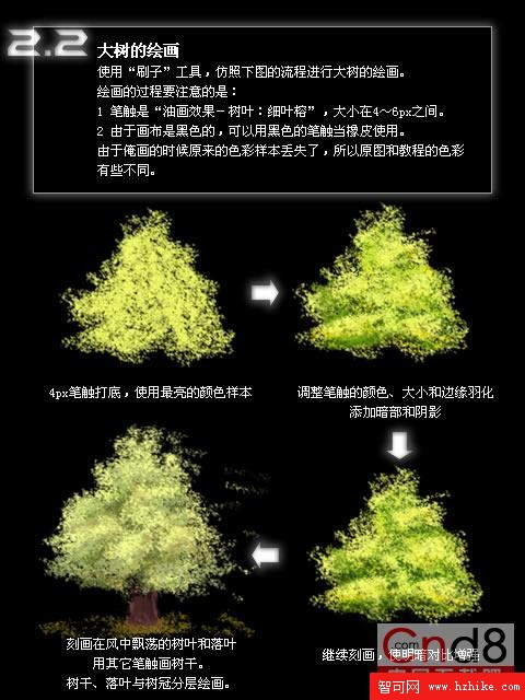 使用“刷子”工具,仿照下圖的流程進行大樹的繪畫。繪畫的過程要注意的是: