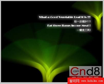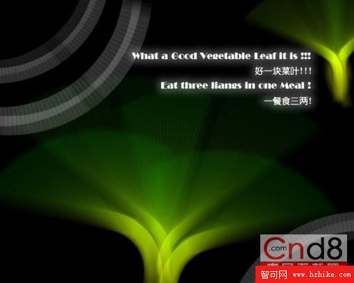 用相同的方法設計不同樣式的菜葉; 然後在一個600*480黑色背景的畫布上擺放好; 然後打上一些發光的文字作為裝飾。