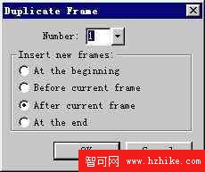第六步:在隨後彈出的對話框中,Nmmber(插入桢的數目)選擇“1”,我們只需要插入一桢即可;Insert ner frames(插入新桢的位置)選項選擇默認的“After current frame(在當前桢的後面)”選項,然後點擊OK按鈕確定,這樣我們就在當前桢的後面(也就是第2桢)插入了一個復制的新桢,新桢的內容和第一桢的內容是完全一致的,如圖06所示: