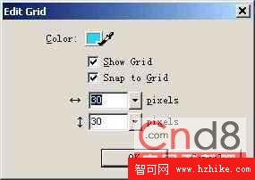 使用菜單命令:VIEw>Grid>Edit Grid,當Edit Grid編輯網格對話窗口被打開時,在Color選項的取色井中我們可以指定網格顯示顏色,這兒我選擇了淡藍色。勾選Show Gird和Snap to Grid這二個選項。下面二個選項,是用來設置網格之間上下、左右的間距,默認的為36象素,您可以改變這個值,本例中設置為30象素,點擊OK按鈕。