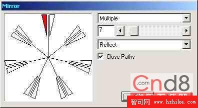 框中分別看到它們的效果,這裡我們介紹一下 Multiple (多重鏡像)的使用方法。如圖七,選項框下面是一個設置復制鏡像數目的拖動條,您可以嘗試點擊拖動條兩側的按鈕——是不是有驚奇的發現呢?再下面的下拉式選項框提供 Reflect (旋轉)與 Rotate (對稱)兩種選擇。 Close Paths 復選框是四種鏡像通用的,它的作用是對象如果包括兩條或兩條以上敞開路徑,且路徑開口小於 General 面板中 Snap distance 欄中的數值,在執行對稱效果時自動閉合路徑。