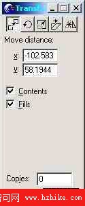 Move (移動) 面板中, Move distance 項決定移動的距離,由 X ( X 軸)、 Y ( Y 軸)兩個數值框中的數值控制; Contents (內容)項決定是否連同 Paste 命令創建的蒙板一起移動; Fills (填充)項決定移動是否對 Tile 填充的內容產生作用; CopIEs 項決定復制對象的數量。