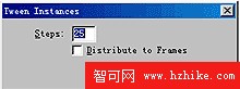 六、這時二個物體都處於被選擇狀態,使用modiy菜單->symbol->tween instances命令,此時會跳出tween instances的對話框。我們在steps中輸入25,注意distribute to frames前面的鉤不要選上,如果選上了的話,就會變成25個幀,成動畫效果,我們這兒需要的是平面的效果。
