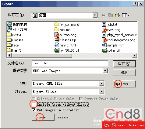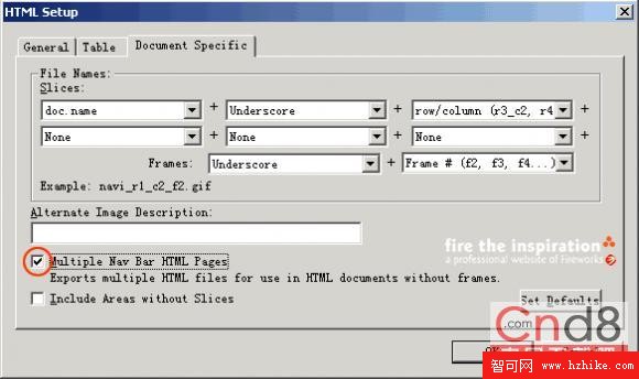 Document Specific:設置自動命名文件的規則,值得一提的是這裡隱藏了一個相當重要的選項Multiple Nav Bar HTML Pages,這個選項決定了是輸出一個HTML文件還是多個HTML文件,如果選擇的話Fireworks會為每個按鈕生成一個自己的HTML頁面,在這個頁面上按鈕處於Down的狀態。如果要決定HTML文件的文件名就要回到Link Wizard窗口的File Name部分,不使用自動命名而手工輸入按鈕的文件名,這樣按鈕的文件名就會與輸出後的Html文件名相對應。