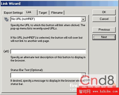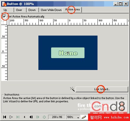 最後,我們切換到Active Area,在這裡可以設定與鏈接有關的參數,所有設定的內容最後都會輸出成標准的Html代碼,我們要做的只是簡單的將輸出的代碼復制到網頁中的相應位置。Set Active Area Automatically會自動設置一個切割,切割的大小與按鈕的大小是一致的,建議使用這個設置,然後點擊Link Wizard進行最後的設置。