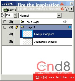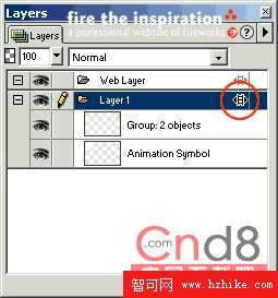 有的時候,一個gif動畫並不單單只是一個動態的效果,你可能還需要在畫板上加上一些靜態的元素,例如公司的Logo等等,如果你現在將這些對象添加到畫板上再回放動畫,你會發現靜態的元素僅僅出現在某一幀上,而其余的幀並沒有分享到這個靜態的對象。這是因為Fireworks有一個分享層的概念,只有將這個層分享後它的內容才會出現在每一幀上。選擇Window->Layers,打開Layers面版。