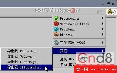 答:點擊畫布窗口右上角的下拉按鈕,從彈出菜單中選擇“FreeHand—導出到FreeHand”或選擇“其它—導出到Illustrator”,都是將文件導出成.ai格式的矢量圖形。