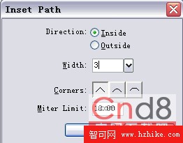 使用菜單命令Modify-Alert Path-Inset Path,打開Insert Path面板,如圖進行設置後點擊OK按鈕(如圖5)。