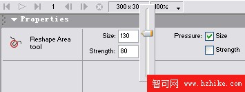 我們只需要在被編輯的矢量元件上拖曳鼠標,Fireworks MX將自動的添加、刪除節點,並且根據設置的變形數值進行變形。拖動在工作區域下面的PropertIEs面板上的size選項後的滑動桿,調整數值為130(如圖4)。