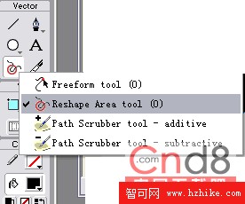 在工具欄上選擇Freeform Tool,按住鼠標將出現一個下拉菜單。選擇Reshape Area Tool(如圖3),此工具可以通過拖動鼠標直接編輯矢量圖形的輪廓而不需要手工的一個節點一個節點的編輯。